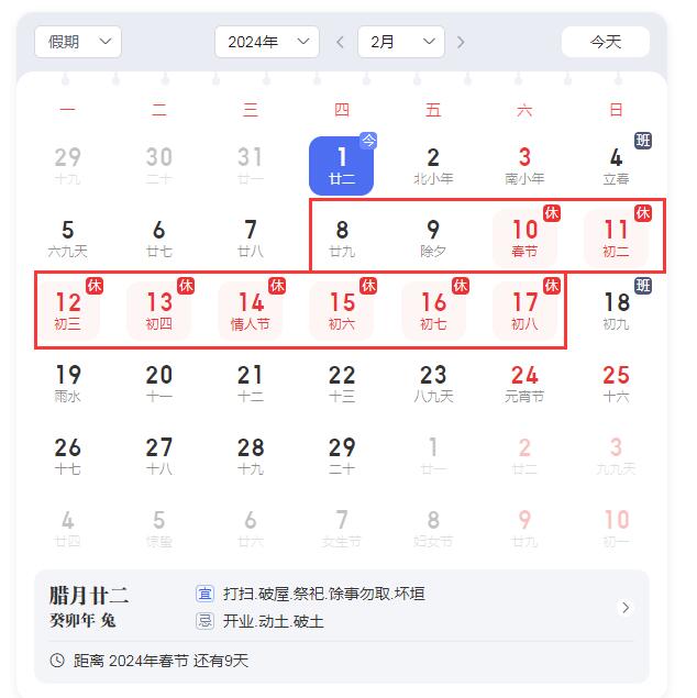 2024年2月8日 (星期四)中午至2月17日(星期六),放假時(shí)間為9天半。2月4日(星期天)、2月18日星期天為調(diào)休時(shí)間公司正常上班。
